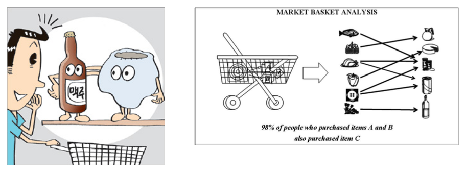 이에 대한 예시로 월마트에서 진행한 장바구니 분석 사례가 있는데, 퇴근길에 아내의 부탁으로 기저귀를 사러 마트에 들렀다가 함께 맥주를 구입하는 남자가 많다는 것에 착안해 월마트가 두 제품을 함께 진열하자 매출이 늘었다는 것이다.