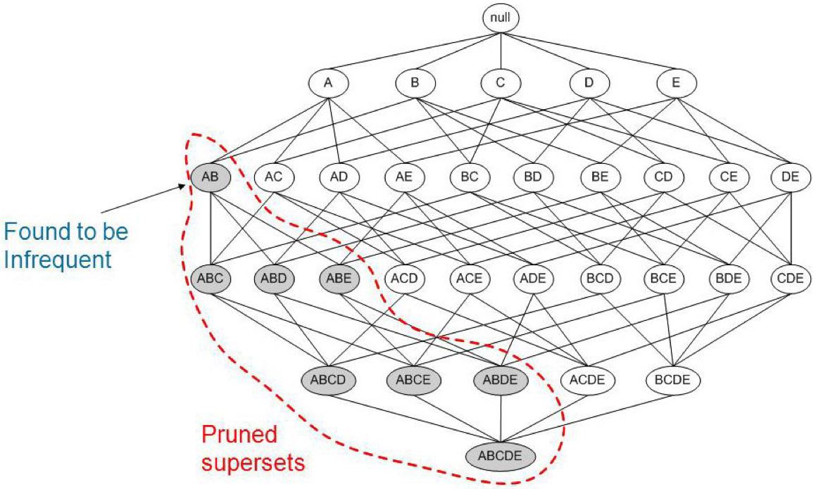 - minsup 및 minconf 임계치에 넘지 못하면 prune하는 규칙