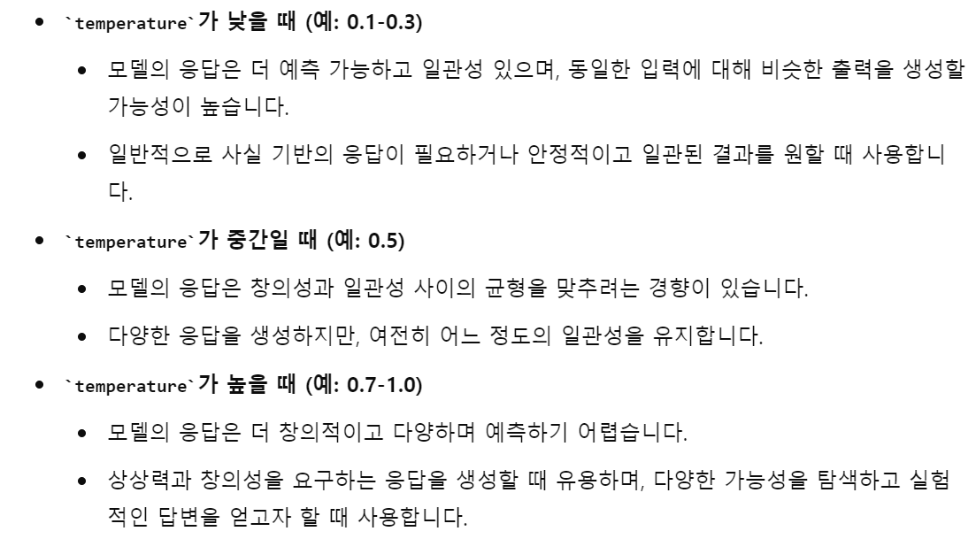 temperature: 얼마나 창의적으로 대답할건지에 대한 설정입니다.