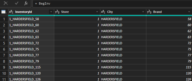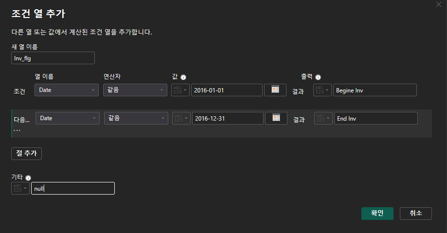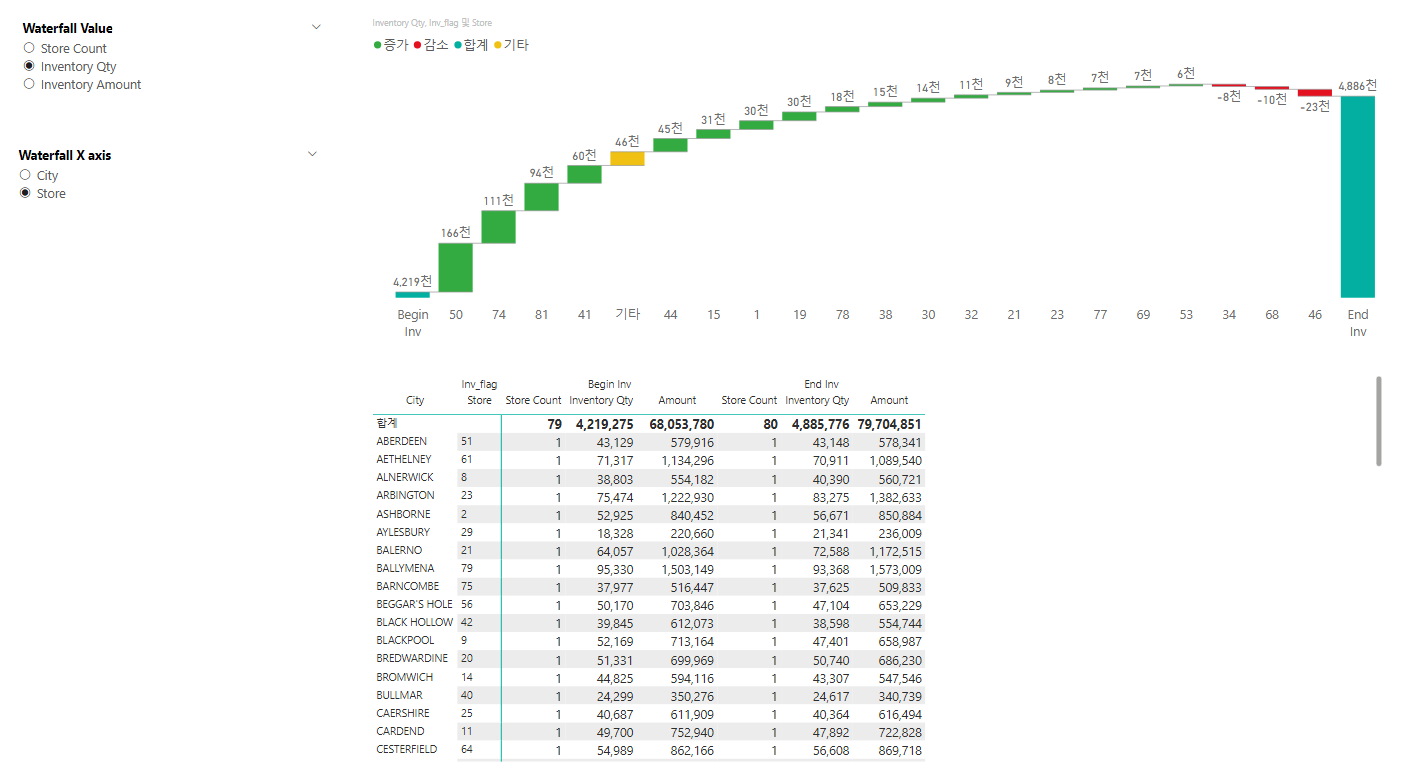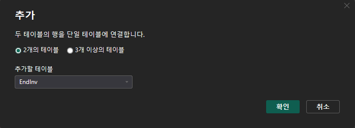 기초 재고와 기말 재고 사이의 변화를 시각화하려면 두 데이터가 한 테이블에 있는 것이 나타내기 용이할 것 같아 두 테이블을 Power BI에서 하나의 테이블로 병합