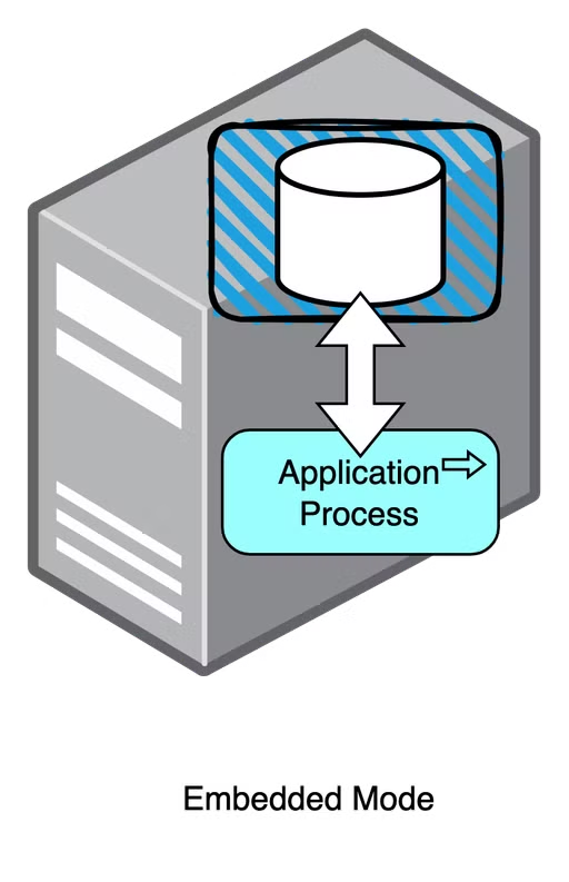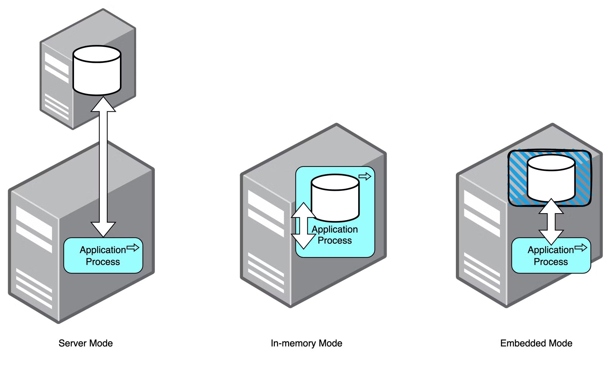 - 임베디드(내장) 모드는 인메모리 모드와 동일하게 애플리케이션에 DB엔진이 내장되어 애플리케이션과 함께 실행되고 종료되는 방식이다.