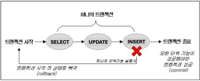 - 요리로 치면, 조리대를 의미하며 재료(데이터)들을 조회해서 생성/수정/삭제 후 최종 결과물을 만들때까지 하나의 작업을 트랜잭션으로 관리할 수 있다. 또한 트랜잭션은 조리(데이터처리)중에 문제가 발생하면, 그전에 했던 변경을 아무일도 없던 것처럼 모두 되돌린다!!