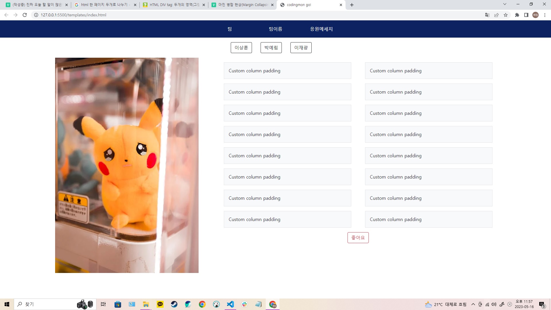 일단 만족보다는 아쉬움을 느끼는 중. 마음 같아서는 더 많은 기능을 넣고 싶은데 아직 미숙해서 지금은 조금 참기로 했다. 하지만 시간이 남는다면 좋아요를 누를때 숫자가 늘어난다던가 배경음악으로 포켓몬 오프닝을 넣는다던가 하고 싶다. 내일은 백엔드 작업에 더 집중할 것 같다. 위에 팀원의 이름을 클릭하면 해당 팀원의 정보가 뜨게 만들 것이다. 피카츄 사진에는 아쉽게도 팀원의 얼굴이 들어갈 것 같다. 힘들게 찾은 저작권 없는 피카츄 사진을 내 얼굴 대신 쓰고싶다... 피카츄 너무 귀엽다.