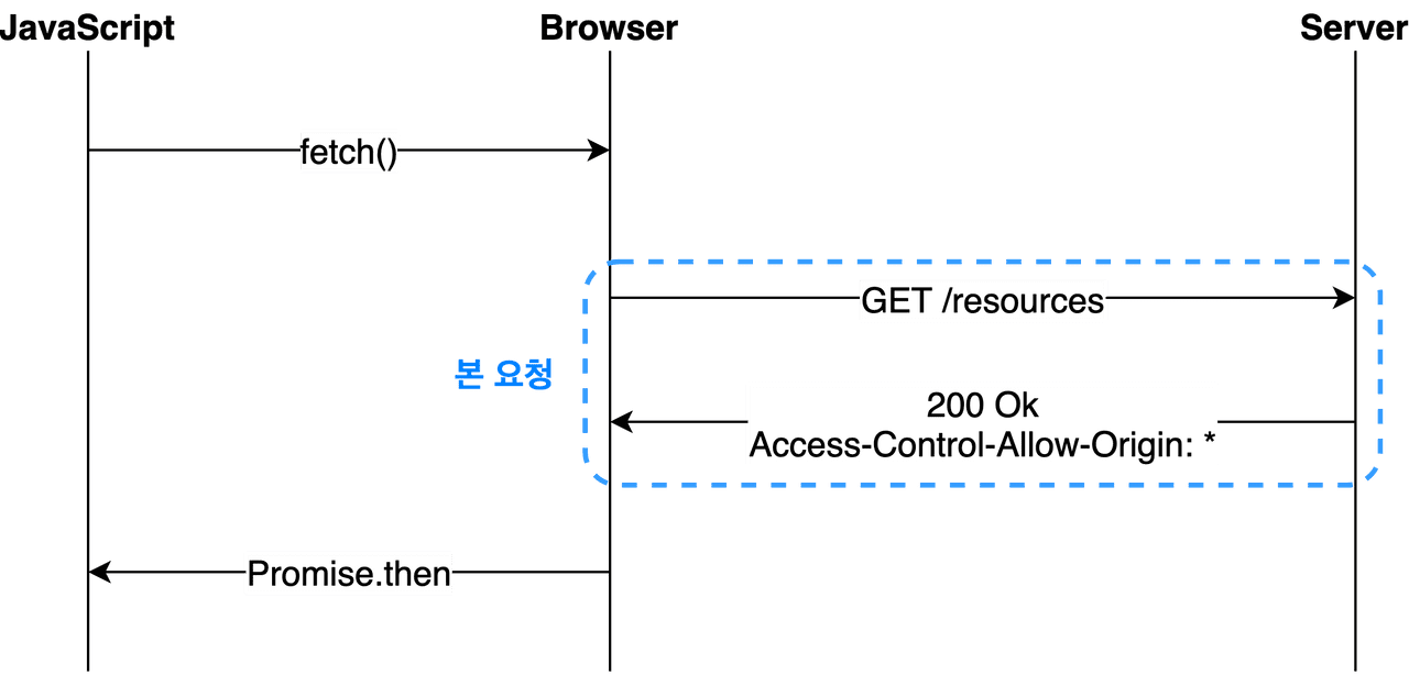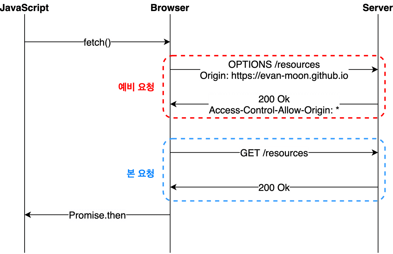 가장 흔한 시나리오로 Preflight라는 예비 요청을 보내 CORS 설정이 되어있는지 먼저 확인하고 본 요청을 보내 데이터를 받아오는 방식이다.