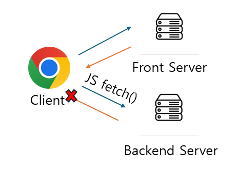 이들 사이에 Proxy Server을 두고 모든 fetch 처리를 Proxy서버에서 다시 백엔드 서버로 전달하면 간단하게 해결가능하다. 여기에 백엔드 서버의 경우 프록시서버의 IP만 WhiteList를 적용한다던지 하는 방향으로 보안 강화도 가능하다.