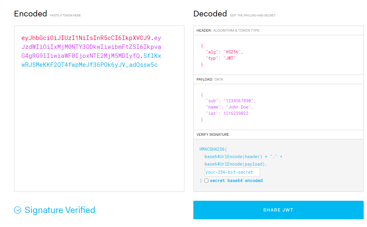 이때 HEADER와 PAYLOAD는 암호화 없이 BASE64방식으로 인코딩만 되어있기에 해커가 쉽게 탈취 후 조작이 가능한데, 서버 측에서 SIGNATURE 부분을 비밀키로 복호화 하면 똑같은 HEADER PAYLOAD가 또 들어가 있기에 두 값이 다르면 해커에게 조작당했음을 알 수 있다.