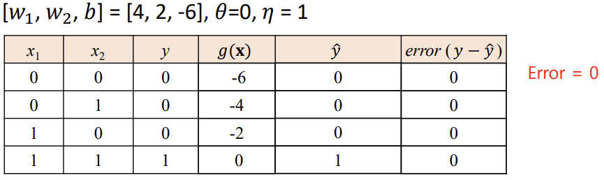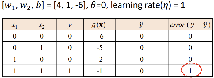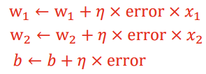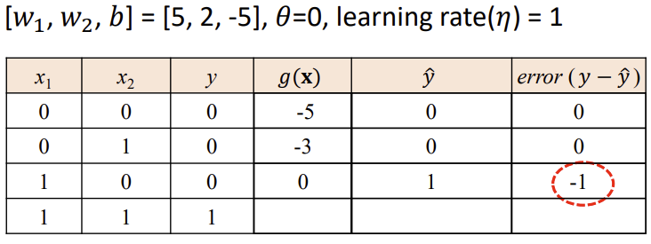 -> 출력이 1이어야 하지만 0이 나온 경우, 입력이 1인 가중치를 증가시킴
