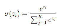 : 입력으로 K개의 실수로 이루어진 벡터 z를 받아, 해당 입력 숫자의 지수에 비례하는 K개의 확률로 이루어진 확률 분포로 정규화함