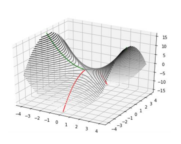 초록색 곡선을 따라 안장점은 local minimum처럼 보이지만, 빨간색 곡선을 따라서는 local maximum처럼 보임
