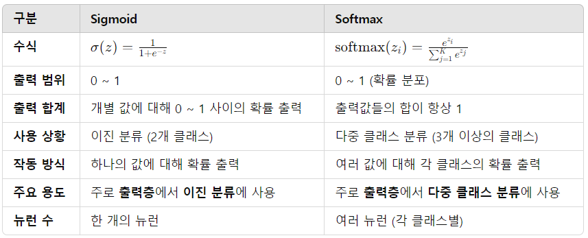 - 분류 문제: 이 경우에는 출력층에서 활성화 함수가 사용됨. 예를 들어, 이진 분류에서는 시그모이드 함수를, 다중 클래스 분류에서는 소프트맥스 함수를 적용해 각 클래스에 대한 확률을 계산함.