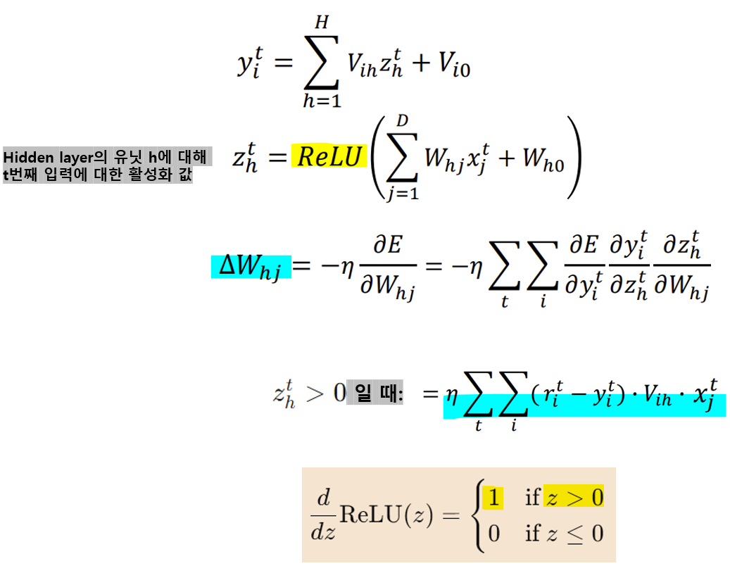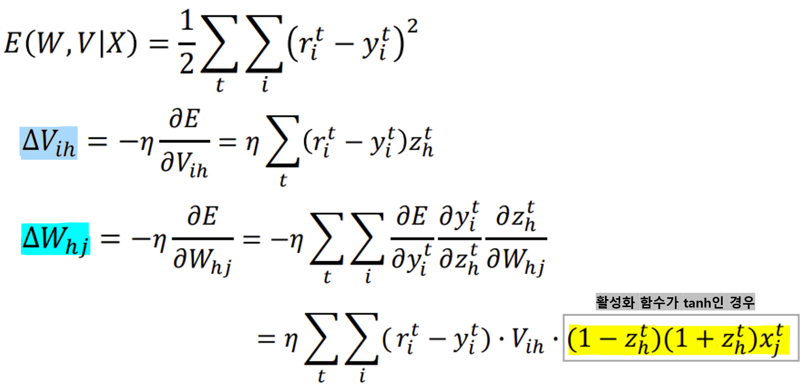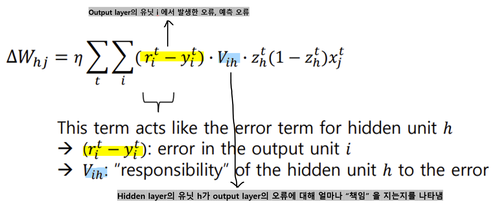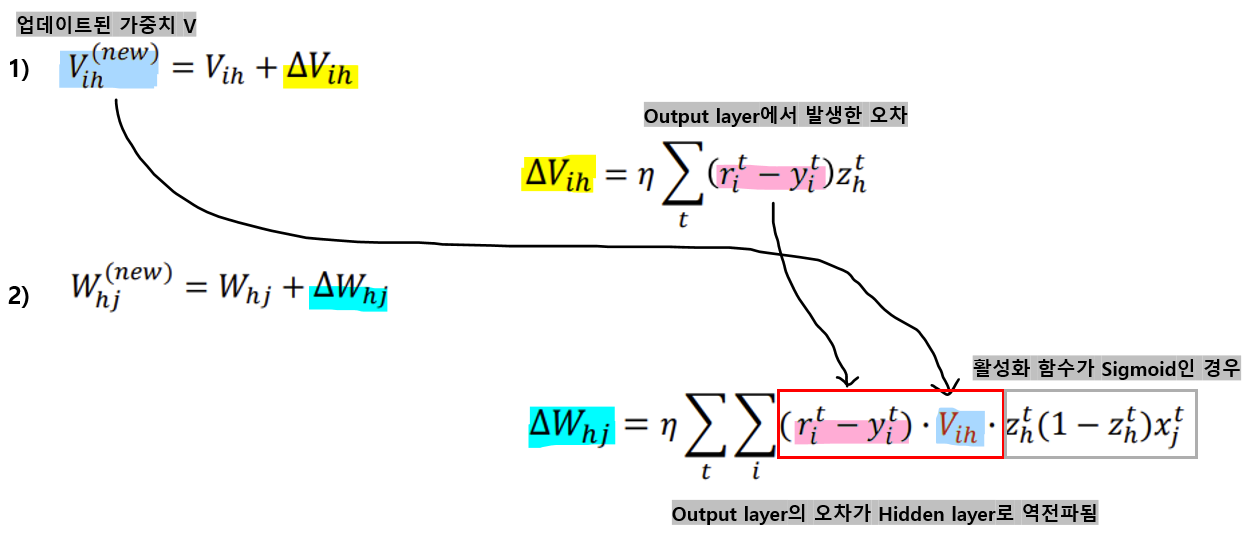-> Output layer에서 계산된 오차를 바탕으로, Hidden layer에서 Output layer로 가는 가중치 V를 먼저 수정한다.- 업데이트된 V(new)를 사용하여 Hidden layer에서 발생한 오차를 계산하고, 그 오차를 바탕으로 Input layer와 Hidden layer 사이의 가중치 W hj를 업데이트