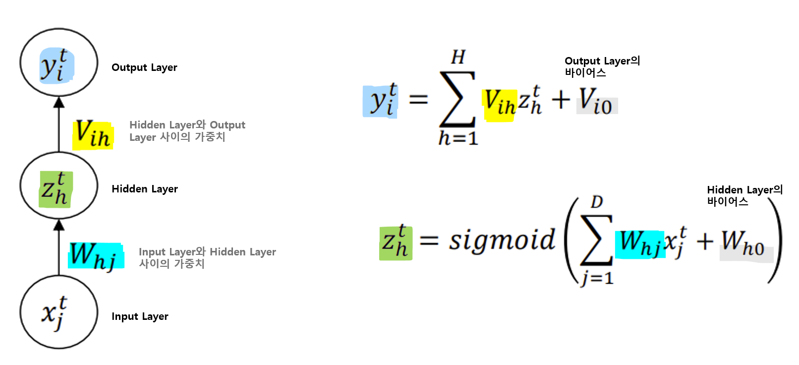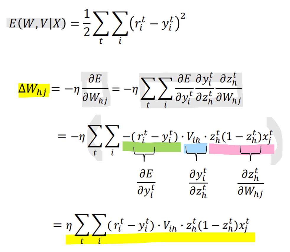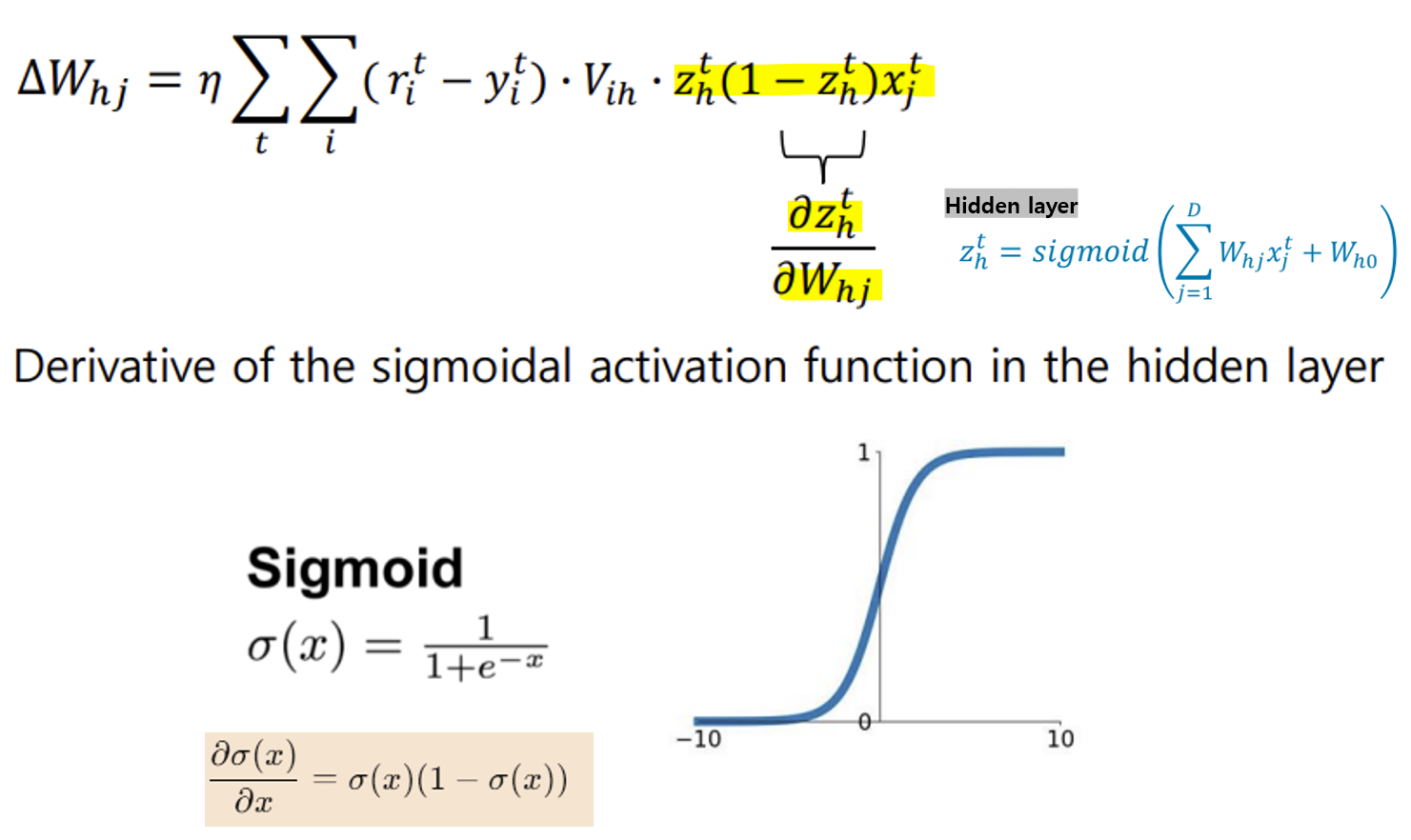 -> Output layer에서 계산된 오차를 바탕으로, Hidden layer에서 Output layer로 가는 가중치 V를 먼저 수정한다.- 업데이트된 V(new)를 사용하여 Hidden layer에서 발생한 오차를 계산하고, 그 오차를 바탕으로 Input layer와 Hidden layer 사이의 가중치 W hj를 업데이트