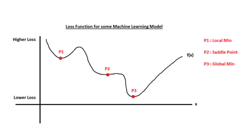-> 이 점은 Cost function의 표면이 안장 모양을 닮은 지점으로, 일부 차원에서는 위로 휘어지고 다른 차원에서는 아래로 휘어짐