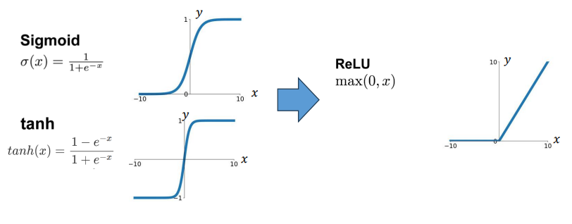 : Sigmoid와 Tanh 함수는 gradient가 거의 0이 되는 문제를 일으키지만, ReLU는 그렇지 않음