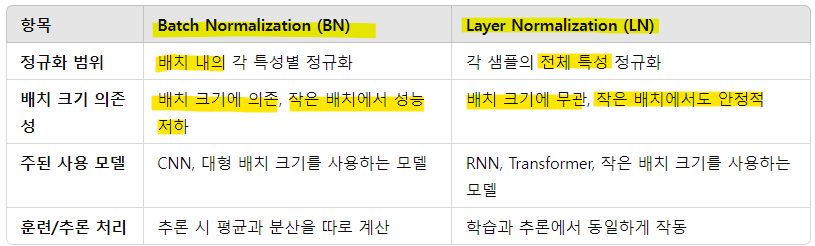 - 각 샘플의 전체 특성(feature)을 정규화함. 즉, 배치 크기에 관계없이 각 샘플의 특성들에 대해 평균과 분산을 계산하여 정규화. 배치 크기와 무관하게 작동함