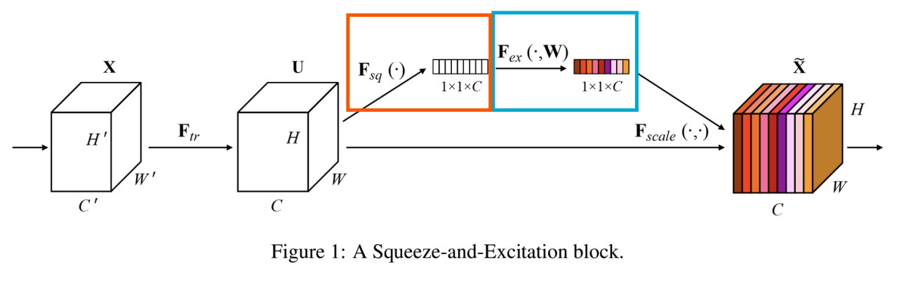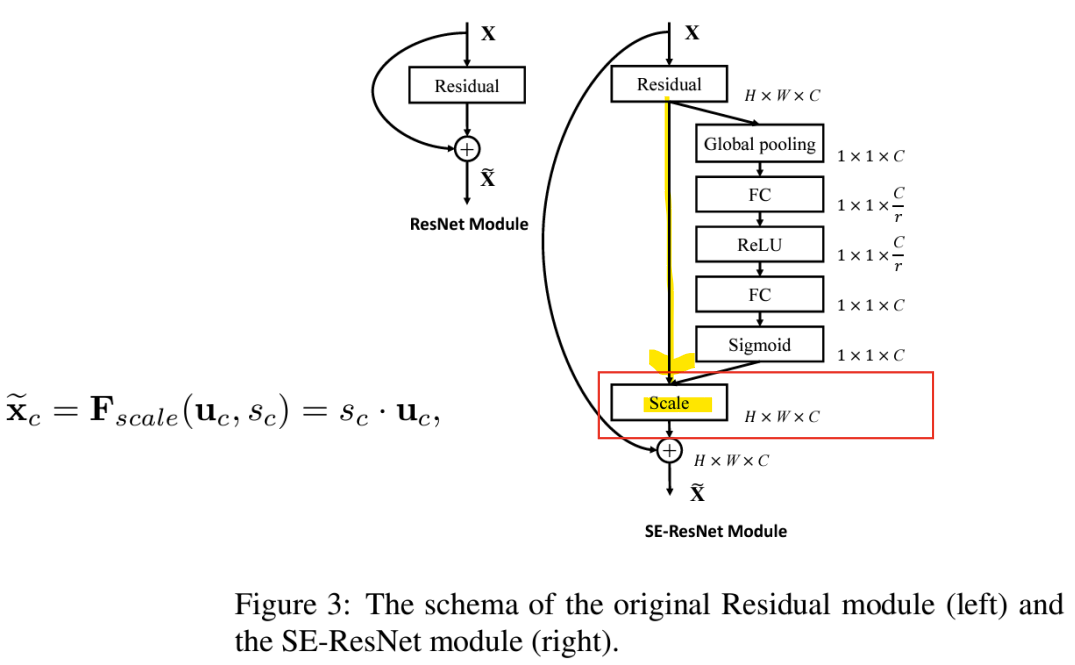 -> feature map과 scalar(SE 블록의 출력) 사이에 채널별 곱셈을 통해 feature map의 가중치를 재조정