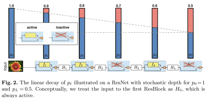 -> 학습 중에 확률적으로 ResBlock을 비활성화(inactive)시킴