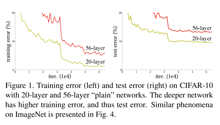 deeper networks가 수렴을 시작할 수 있을 때, 성능 저하 문제(degradation problem) 발생