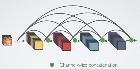-> l번째 레이어는 모든 이전 레이어의 특징 맵을 받음