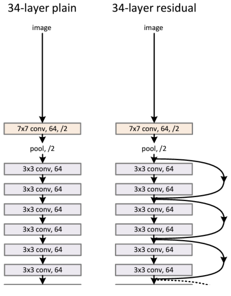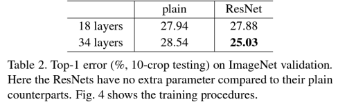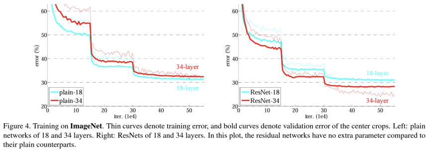 -> plain의 경우 34 layers가 18 layers 보다 성능이 더 떨어짐