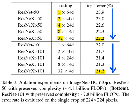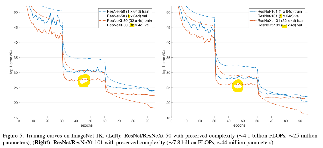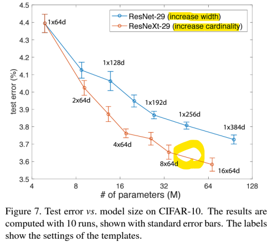 -> Cardinality를 증가시키면(ResNeXt) 성능이 꾸준히 향상됨