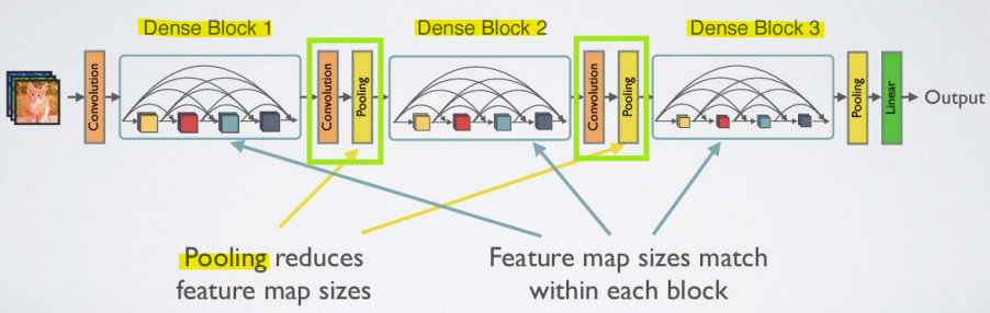 -> down-sampling을 용이하게 하기 위해 네트워크를 여러 개의 밀집 연결된 Dense Block으로 나눔