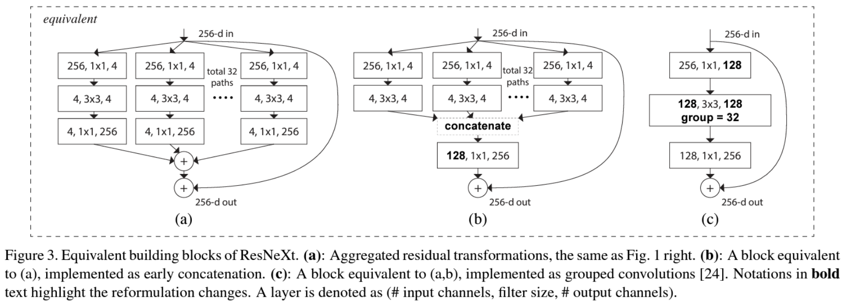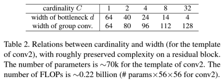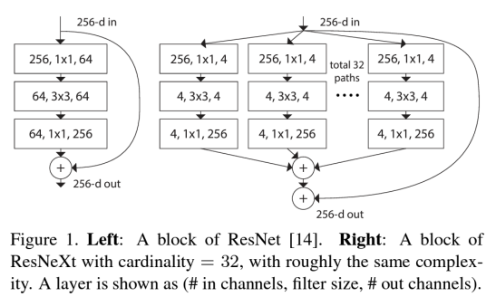 - Cardinality : 병렬 경로의 수 (하나의 residual block 내에서의 경로 수)