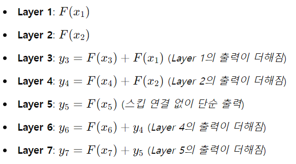 ex) 3번째 layer에서 F(x3)라는 출력값이 나왔다면, skip connection을 통해 이 값이 5번째 layer의 출력값에 더해짐
