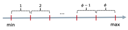 : 숫자 데이터가 포함된 범위를 𝜙개의 구간으로 나눔 (𝜙: 나눌 구간의 개수)