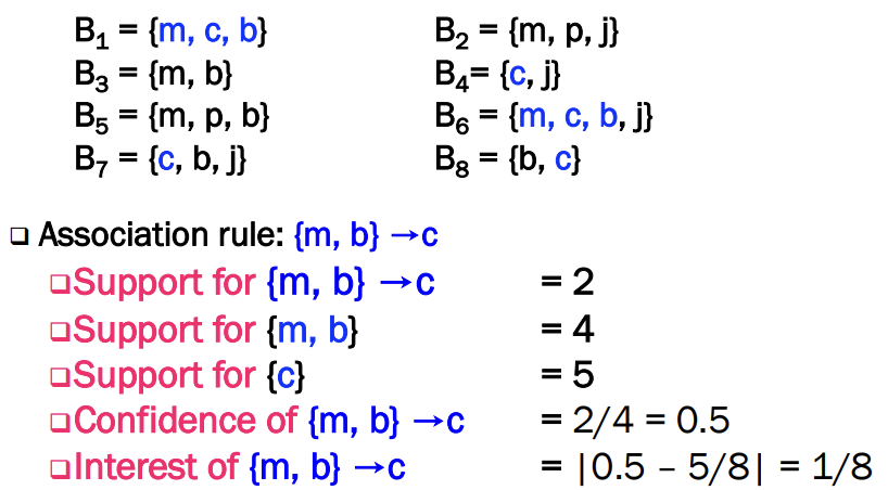 -> "basket에 i1, ... ik가 모두 있으면 j도 있을 가능성이 높다"라는 의미