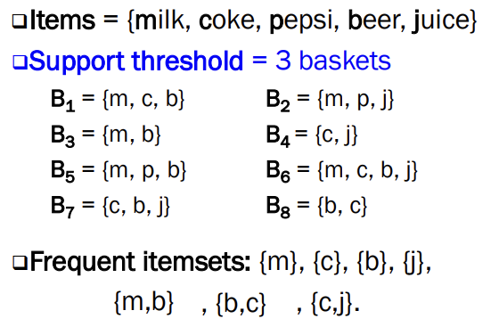 - Frequent itemsets : Support threshold s가 주어졌을 때, 최소 s개의 baskets에 나타나는 아이템 집합
