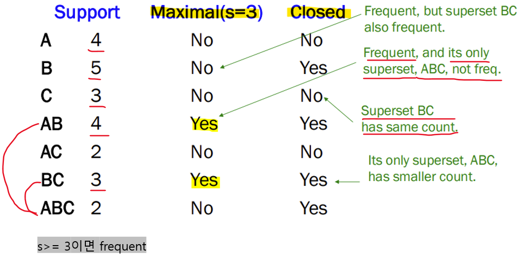 : 그 항목 집합과 같은 지지도(support)를 가지는 즉시 상위 집합이 없는 항목 집합(>0)