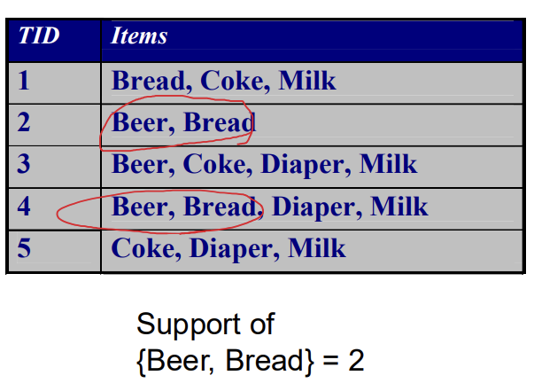-> 3번(support threshold) 이상 등장하면 Frequent itemsets