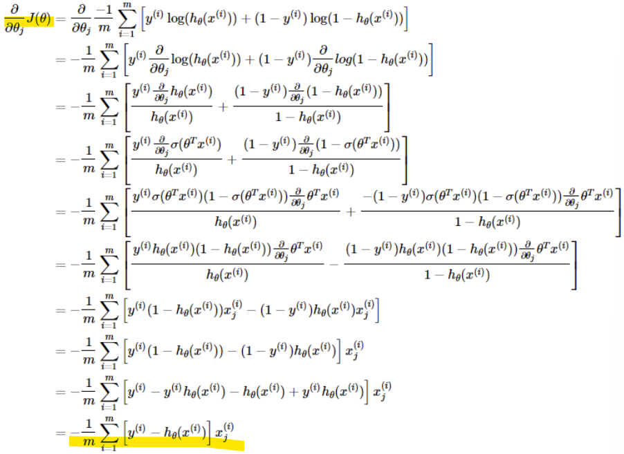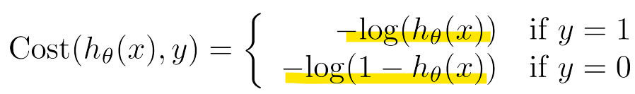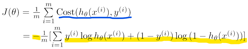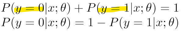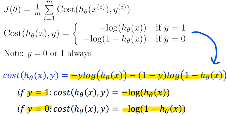 -> y = 0이거나 y = 1뿐이므로 하나의 식으로 합칠 수 있음(linear가 아닌 classification이라서)