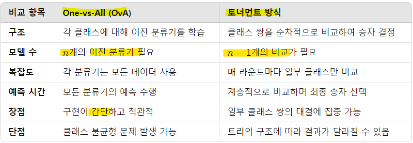 : 각 클래스에 대해 개별 이진 분류기 학습함 (각 분류기는 해당 클래스 vs 나머지 클래스를 구분하도록 학습)