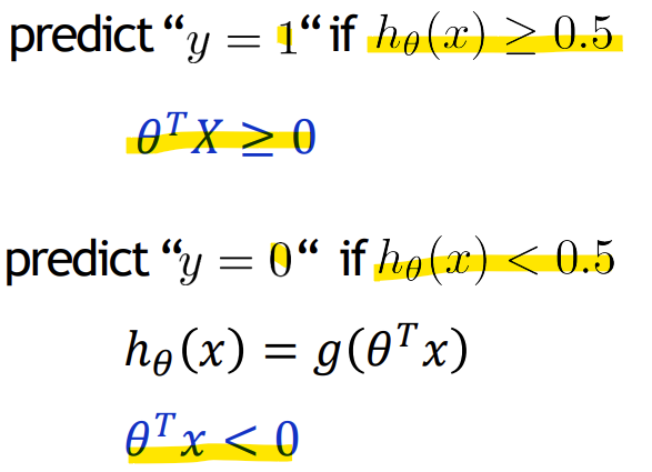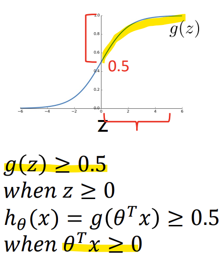 -> z가 0보다 크거나 같을 때 g(z)가 0.5보다 크거나 같음