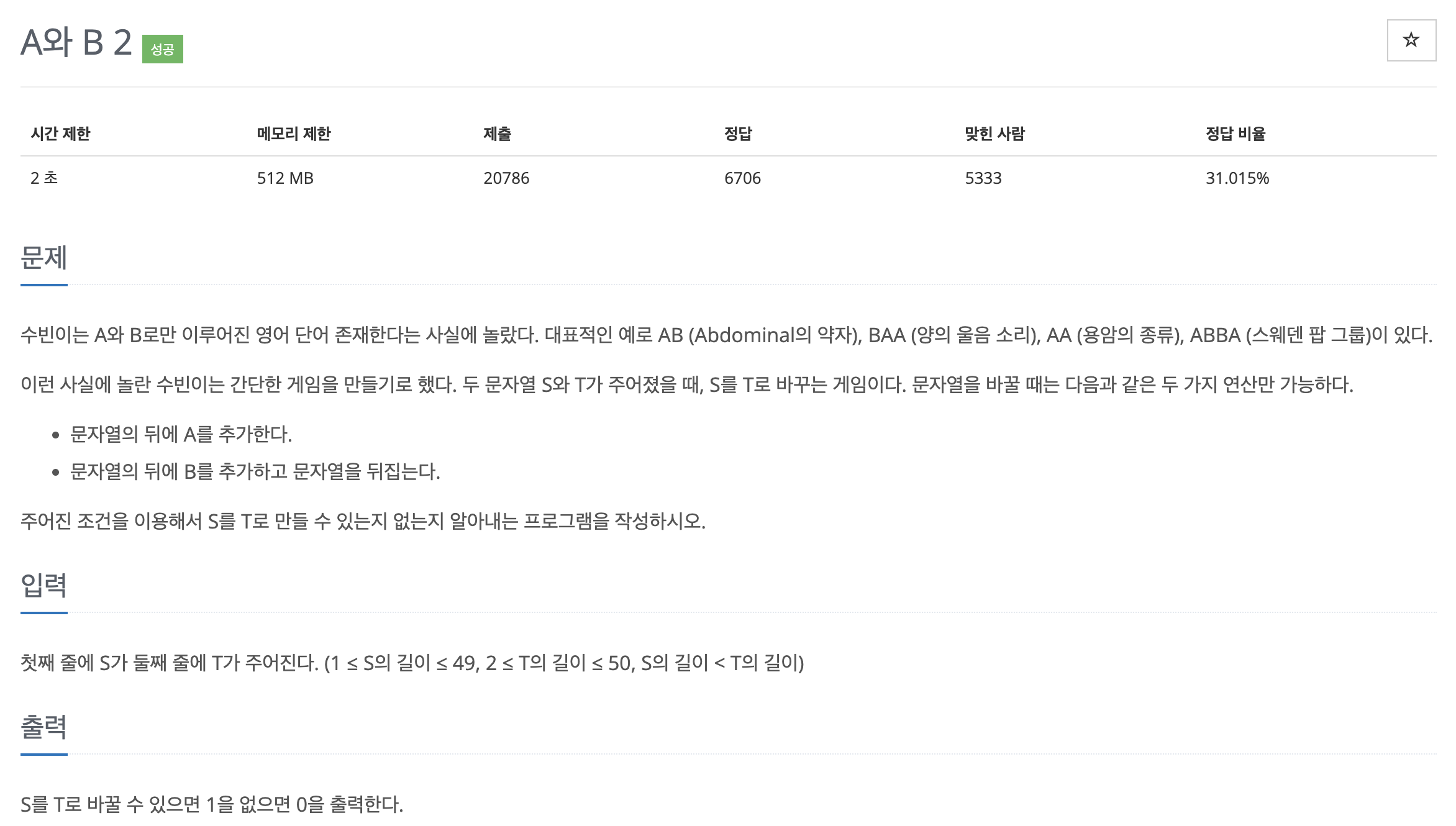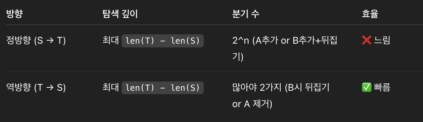 S -> T로 정방향 탐색(시간초과)보다 T -> S로 역방향 탐색하는 것이 경우의 수가 훨씬 적어 효율적이기 때문에 시간초과가 나지 않음!