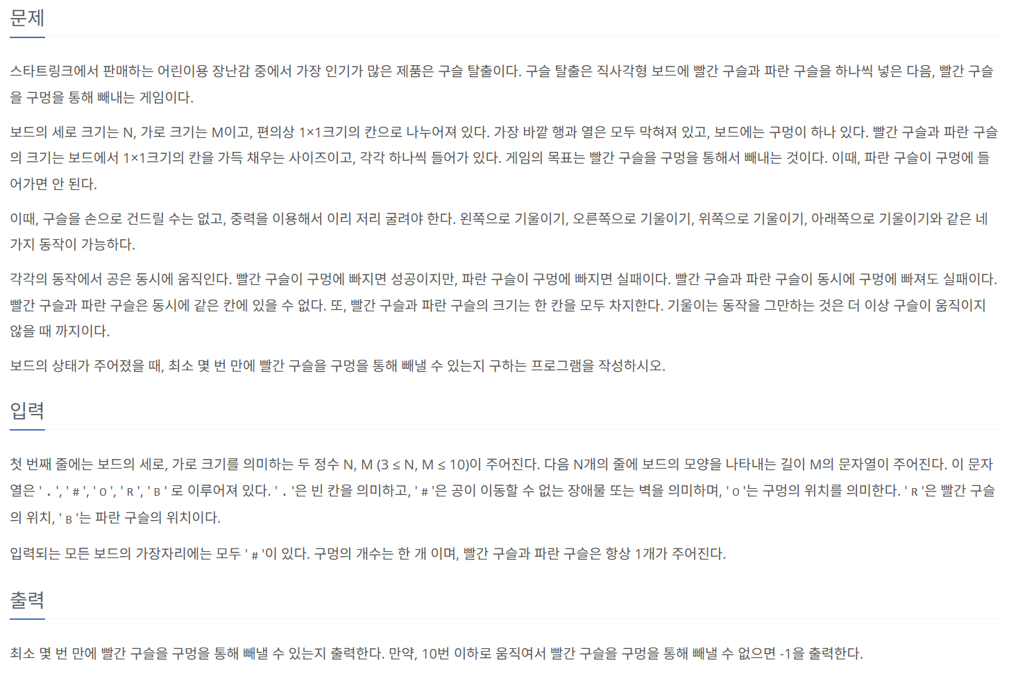# 중요: 구슬이 같은 위치에 위치하면, 둘 중 더 많이 움직인 구슬을 한칸 뒤로 빽하기