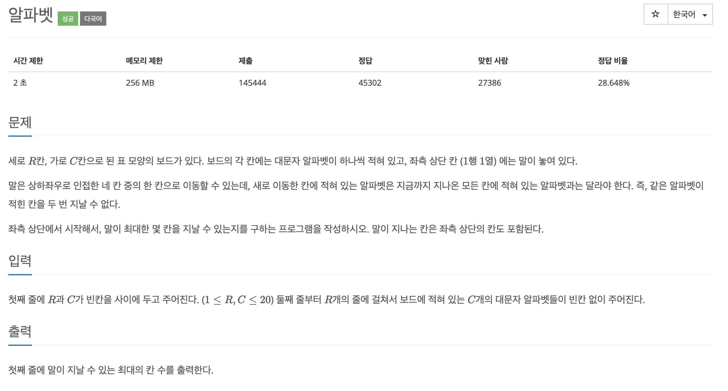# dfs(maps, nx, ny, alphabets.union({maps[nx][ny]}), level + 1)