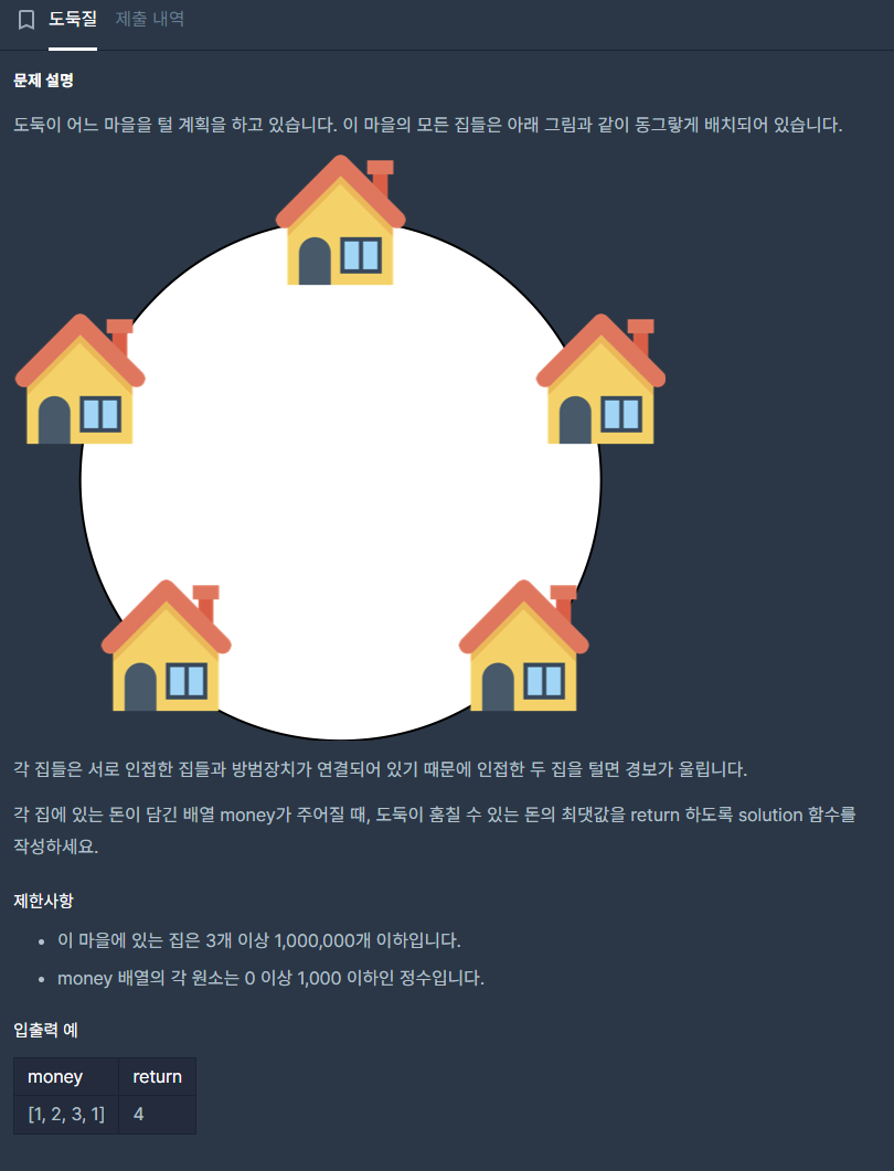 -> dp[i - 2] + money[i]: 이번 집 털고, 전전 집까지의 최대값 더하기- 원형인 경우 2가지 케이스로 나눠 풀기: