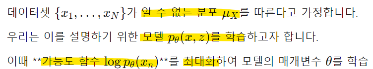 데이터를 설명하는 모델을 학습하기 위해 데이터 가능도(likelihood)를 최대화하기 위해