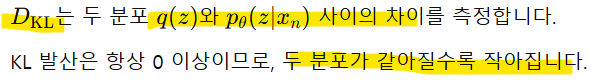 - 더 유연한 근사 분포: 𝒒𝜶(𝒛|𝒙𝒏)를 신경망 같은 복잡한 함수로 파라미터화하면, 단순한 정규분포보다 훨씬 유연하게 𝒑𝜽(𝒛|𝒙𝒏)를 근사할 수 O