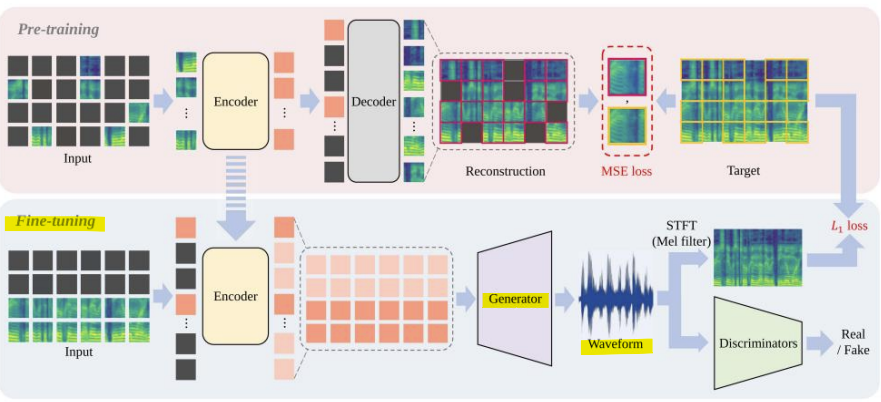 -> waveform generator: 오디오 데이터를 최종적으로 고품질 원본 신호(waveform)로 변환하는 모듈