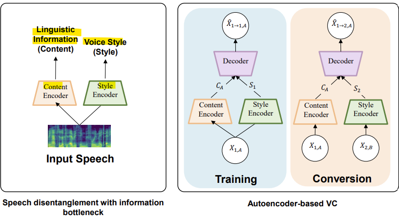 : source speech의 내용 정보를 유지하면서, target voice의 스타일로 변환하는 기술