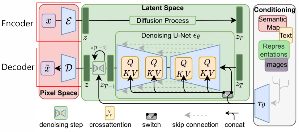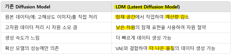 -> 데이터를 직접 다루는 대신, 데이터를 잠재 공간(latent space)으로 변환하여 효율적으로 학습하고 생성 과정을 수행하는 방법