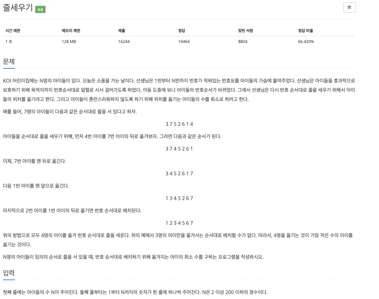 순서대로 배치하기 위해 옮겨지는 아이의 최소 수를 구하는 문제