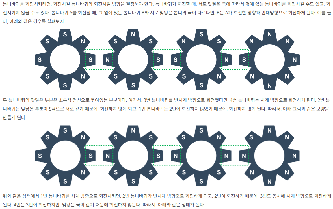 # 0~1, 1~2, 2~3 번 톱니가 서로 극이 다른지를 저장하는 리스트, (True면 같고, False면 다름)