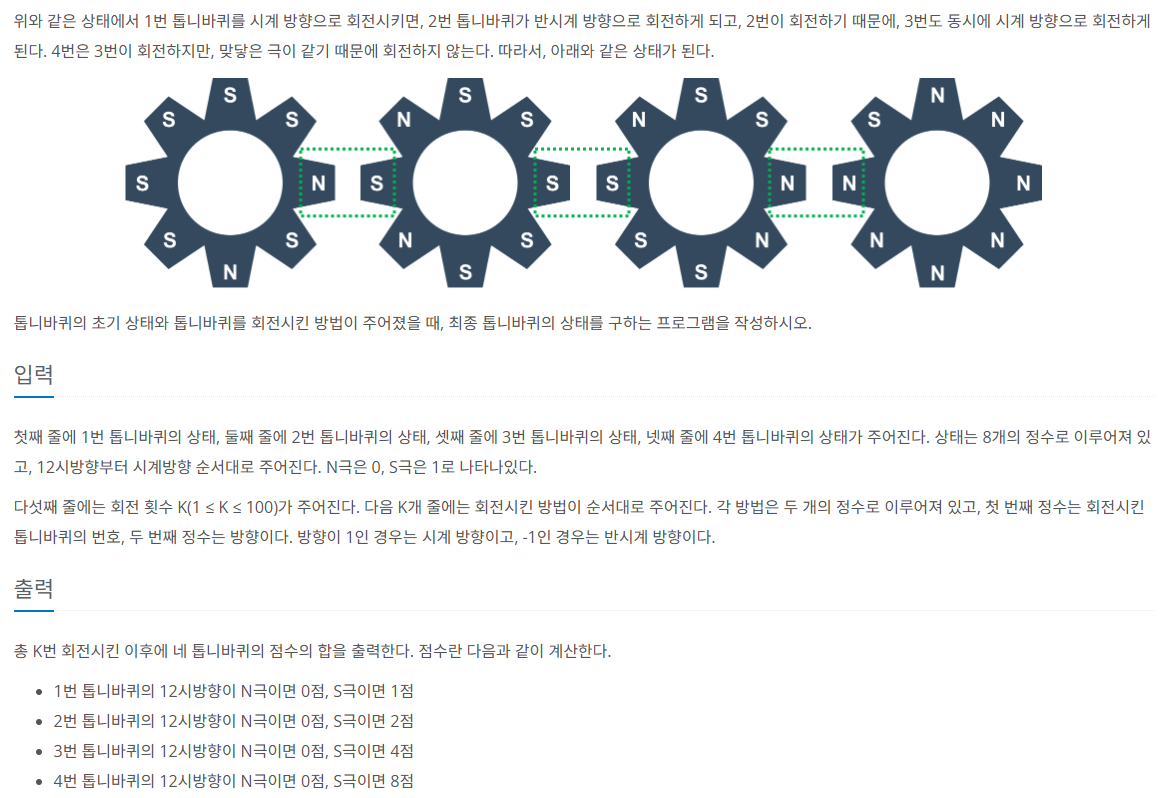 check_left(num - 1, d) # 현재 회전시키고자 하는 톱니 기준으로 왼쪽 톱니 체크