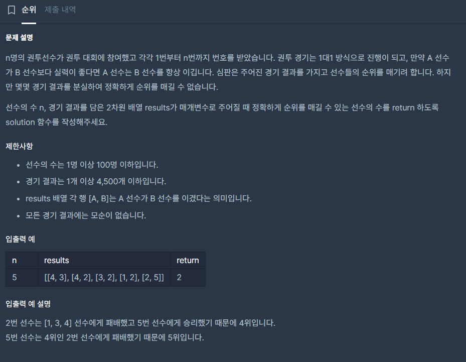wins = bfs(graph, n) # 각 선수들이 이길 수 있는 사람들 리스트(0~n-1)