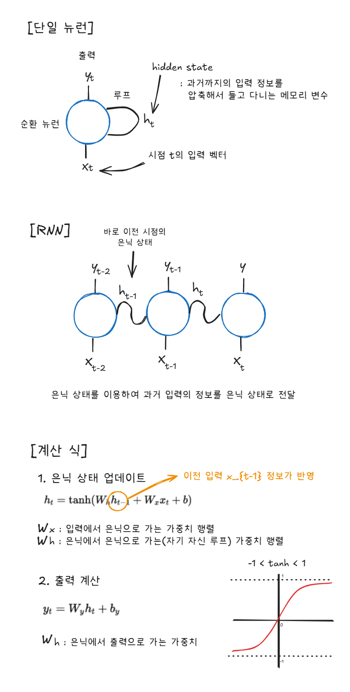 일반적인 MLP는 입력을 독립적으로 처리하기 때문에 이런 순서를 직접 고려하지 못한다. 반면 RNN은 은닉 상태를 통해 이전 시점의 정보를 현재로 전달하여 순서와 맥락을 학습할 수 있다.